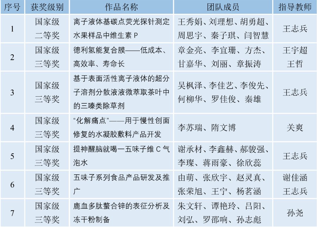 我院共有27支队伍参赛,经过资格审查、网络评审、现场答辩等环节,由我校化学与生命科学学院王志兵老师指导,王秀娟等同学完成的《离子液体基碳点荧光探针测定水果样品中维生素P》荣获国家级二等奖,由王宇超和王哲老师共同指导、章金亮等同学完成的《德利氢能复合膜——低成本、高效率、寿命长》等6项作品荣获国家级三等奖。另外,我校参赛团队还荣获省级一等奖1项、二等奖6项、三等奖6项。